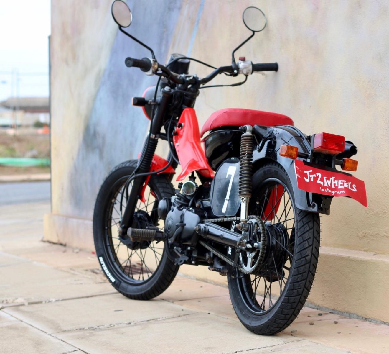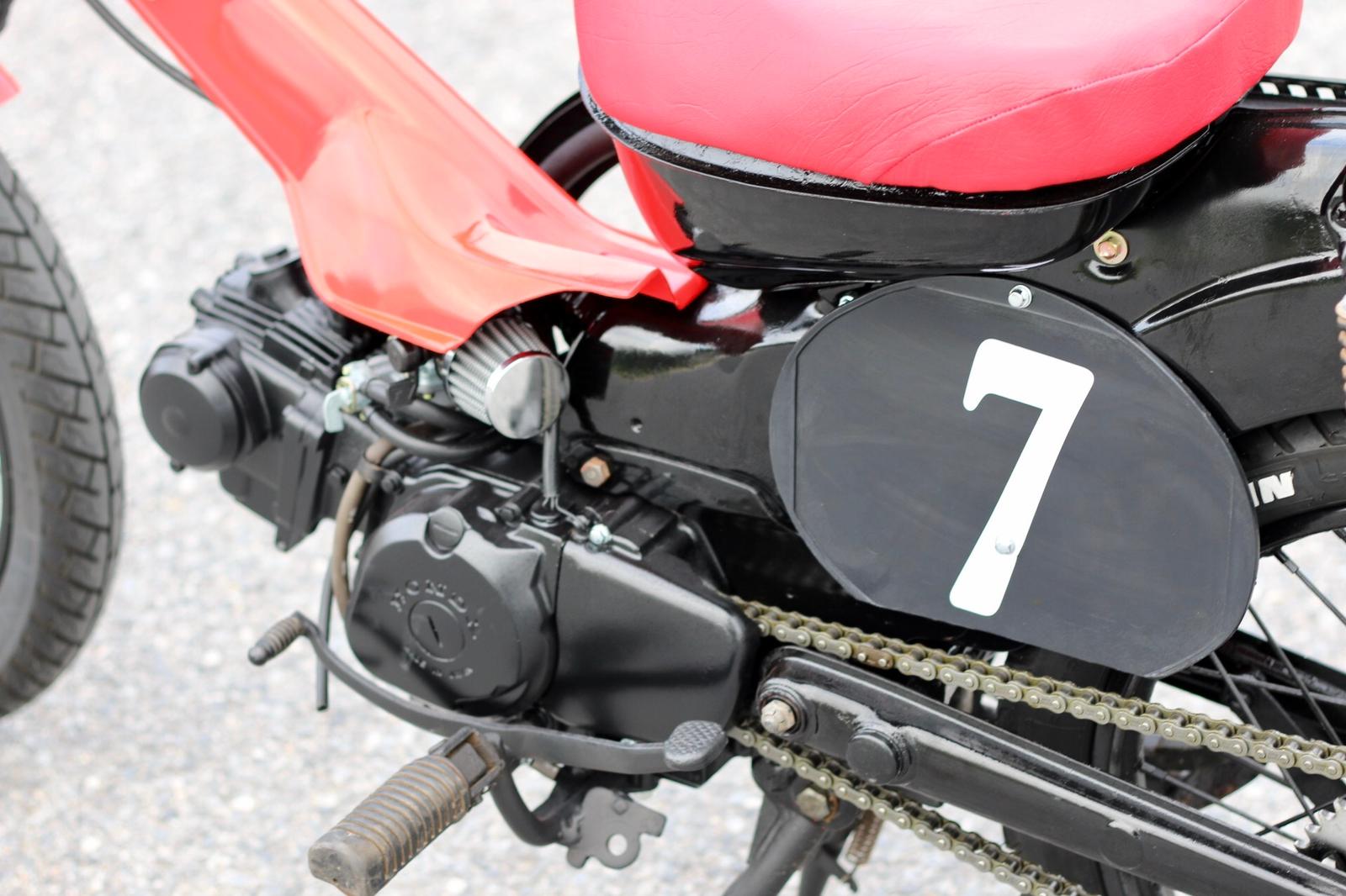 During assembly, I decided not to use the factory airbox to keep the bike looking clean and minimal. Instead, I fitted our Carb110 carburettor with a PF1 pod filter, along with an RP8 black oval number plate finished with a lucky number 7. I retained the factory muffler but installed a larger baffle for improved sound, finishing it in heat-proof satin black. Fitted a set of Michelin city tyre and used a white tyre pen bring out the logo.