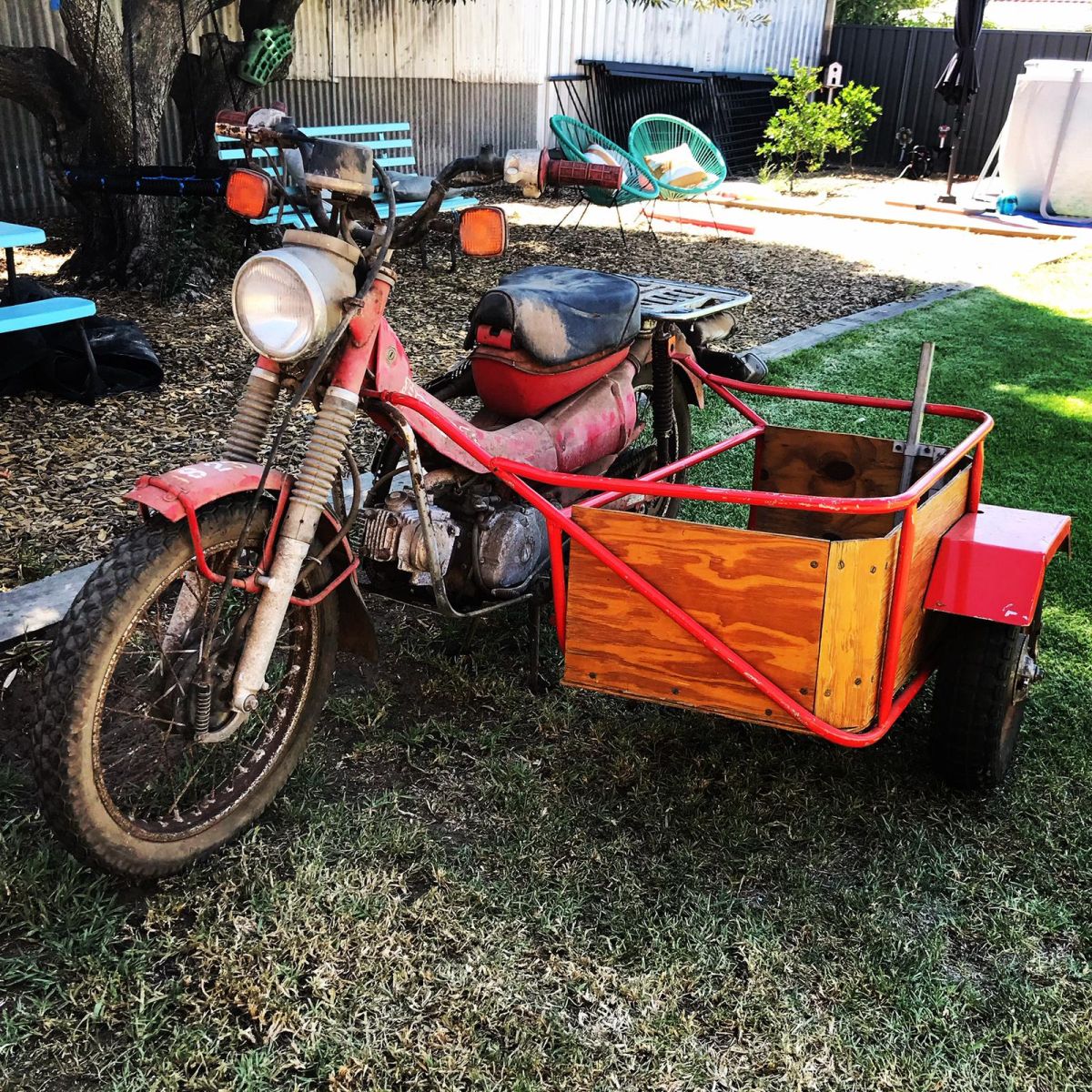 One of my favourite budget builds is this 1994 CT110 Postie bike. It originally started life as a side-car golf cart in Port Lincoln, South Australia. I picked it up for a few hundred dollars in poor condition, as you can see from the photos. As with most bikes I buy, the first step was to get it running and see what needed attention. Unfortunately, compression was very low, so a full teardown was the only option.