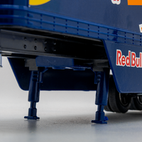 Featuring the unmistakable Red Bull and KTM Factory Racing livery, the detailed rig boasts an authentic cab and trailer design, rolling wheels, and working support legs, trailer rear door for realistic display. The trailer detaches easily, showcasing the finely crafted undercarriage and connector pin details.