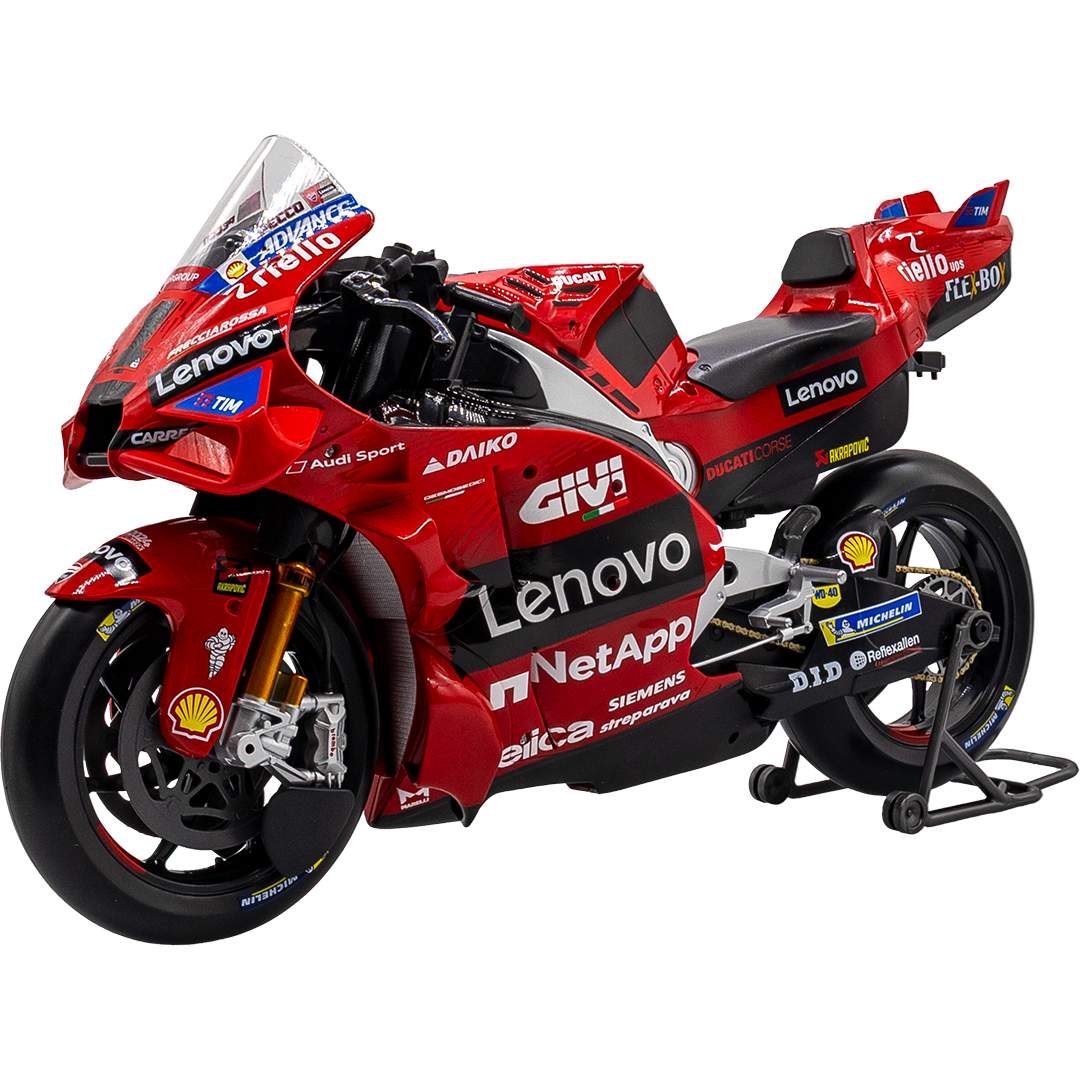 Featuring the championship-winning #1 machine of Francesco Bagnaia and the #23 bike of Enea Bastianini, this collectible captures the precision and aggression of Ducati’s premier class machinery.
